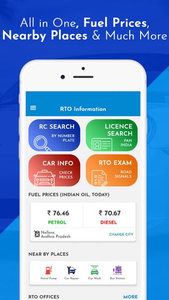 RTO 정보 - 차량 정보의 주요 기능 중 일부는 주차된 차량의 RTO 등록 세부 정보를 확인할 수 있는 기능, 등록 번호를 입력하여 차량 소유자를 검색할 수 있는 기능, 그리고 주유소, 세차장, 버스 정류장 등과 같은 인근 장소를 찾을 수 있는 기능을 포함합니다.